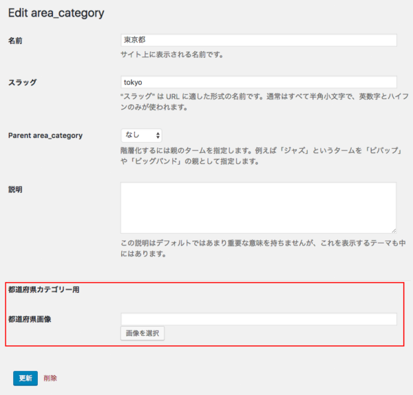 カスタムフィールドを作成しますと、該当のタクソノミーのタームの編集ページに、カスタムフィールドが表示されています。これで完成です!